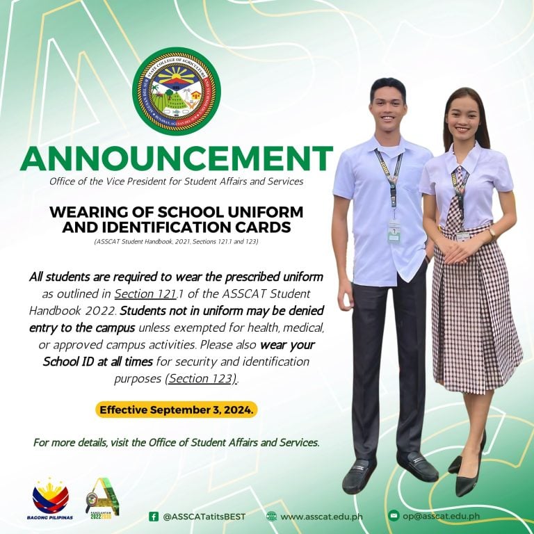 Starting September 3, 2024, all students are 𝐫𝐞𝐪𝐮𝐢𝐫𝐞𝐝 to wear the prescribed uniform as outlined in Section 121.1 of the ASSCAT Student Handbook 2021. Failure to comply may result in being denied entry to the campus, unless exempted for health, medical, or approved campus activities.