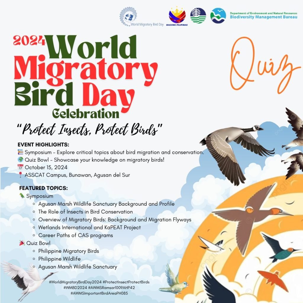 The Agusan del Sur State College of Agriculture and Technology (ASSCAT), through its ππππππ ππ¨π₯π₯ππ π π¨π ππ«ππ¬ ππ§π πππ’ππ§πππ¬, in partnership with the Agusan Marsh Wildlife Sanctuary Protected Area Management Office, invites everyone to join in the celebration of World Migratory Bird Day. This significant event, scheduled for October 15, 2024, at the ASSCAT Campus in Bunawan, aims to raise awareness about the vital role of migratory birds and the importance of conserving their habitats.