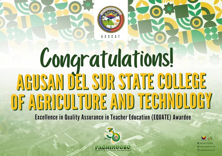 Agusan del Sur State College of Agriculture and Technology (ASSCAT) proudly stands among the recipients of the Excellence in Quality Assurance in Teacher Education (EQUATE) Awards by the Commission on Higher Education (CHED). The awarding takes place today, April 2, 2025, at the Manila Hotel.