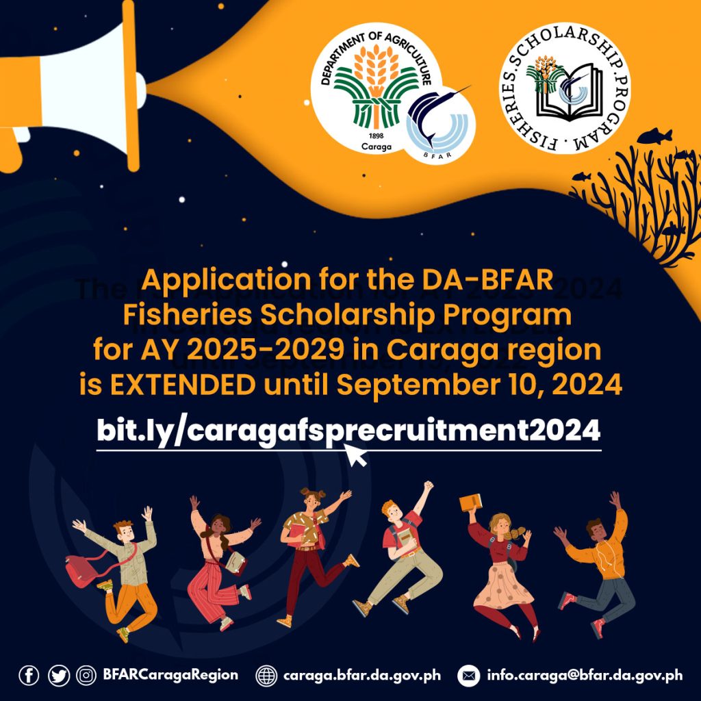 The DA-BFAR #FisheriesScholarshipProgram (FSP) Application for AY 2025-2029 in Caraga region is EXTENDED until September 10, 2024. Hurry and seize the opportunity to be part of the growing family of FSP scholars!