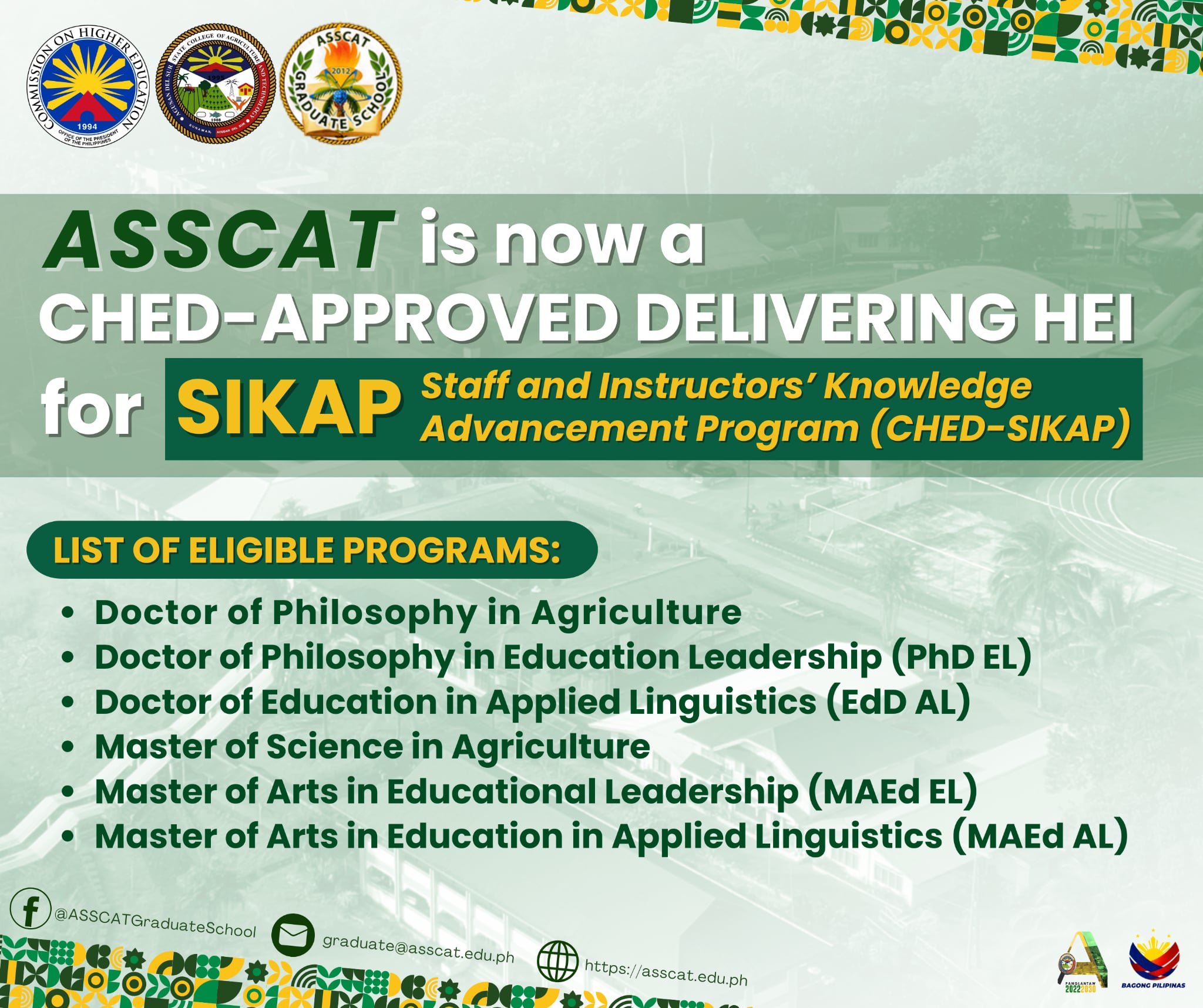 ASSCAT Graduate School Hosts BALAYAG 2025: Championing Critical Dialogue in Graduate Research Read More … ASSCAT Graduate School Hosts BALAYAG 2025: Championing Critical Dialogue in Graduate Research August 4, 2025 ASSCAT and DOST Unveil Agri-Incubator for Local Startups August 1, …