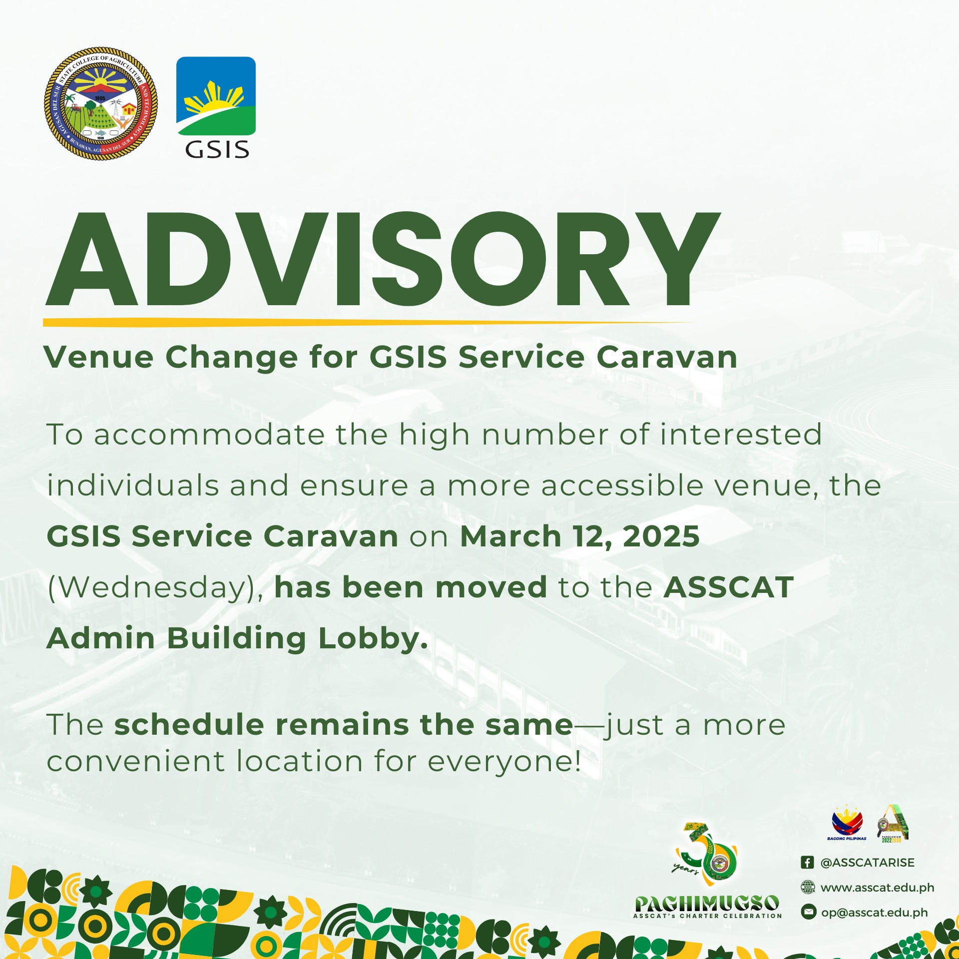 To accommodate the high number of interested individuals and ensure a more accessible venue, the GSIS Service Caravan on March 12, 2025 (Wednesday), from 9:00 AM to 3:00 PM has been moved to the ASSCAT Admin Building Lobby. The schedule …