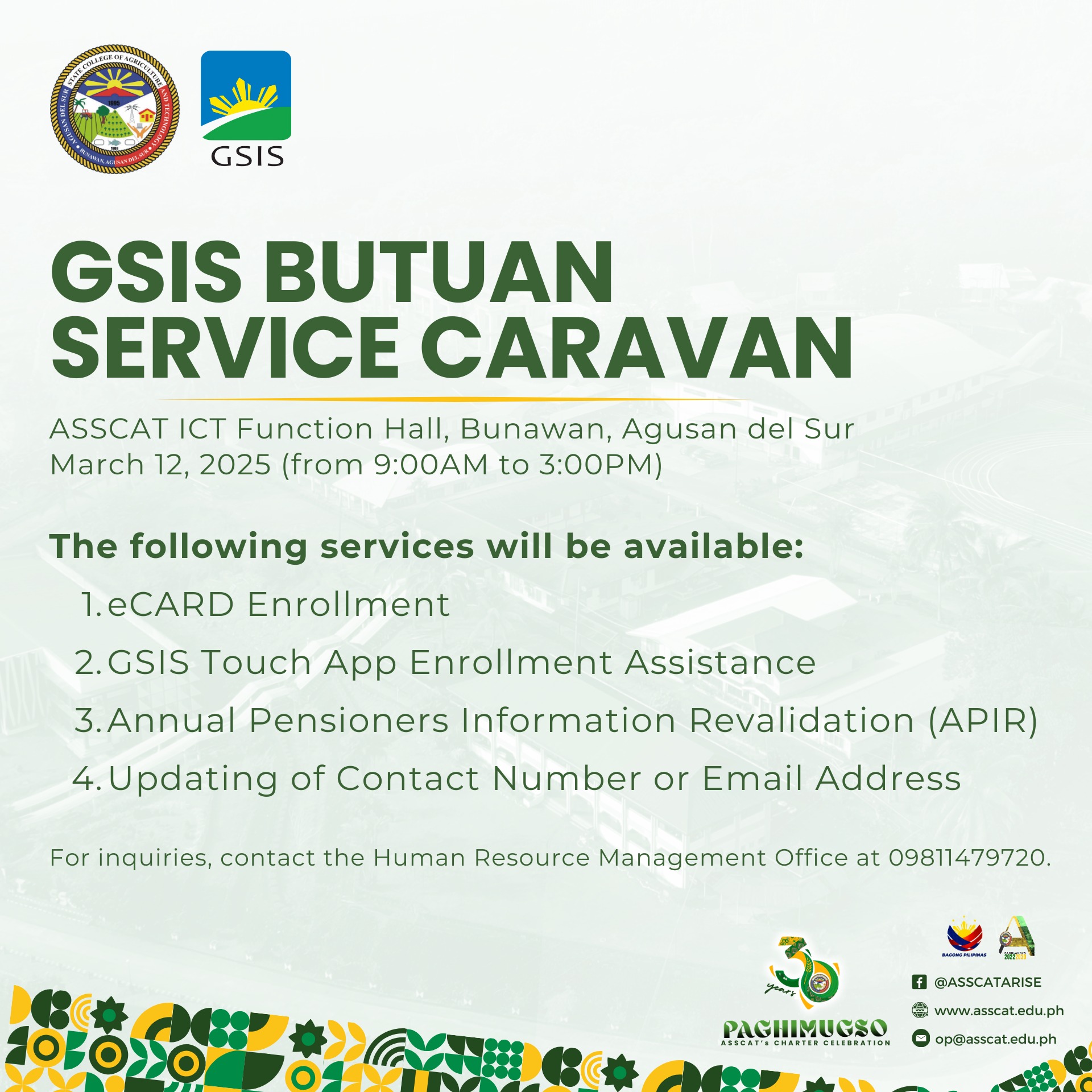 The Government Service Insurance System (GSIS) is bringing its services closer to you! Take advatage of the GSIS Service Caravan this March 12, 2025 (Wednesday), from 9:00 AM to 3:00 PM at the ICT Function Hall, ASSCAT Main Campus, Bunawan, …