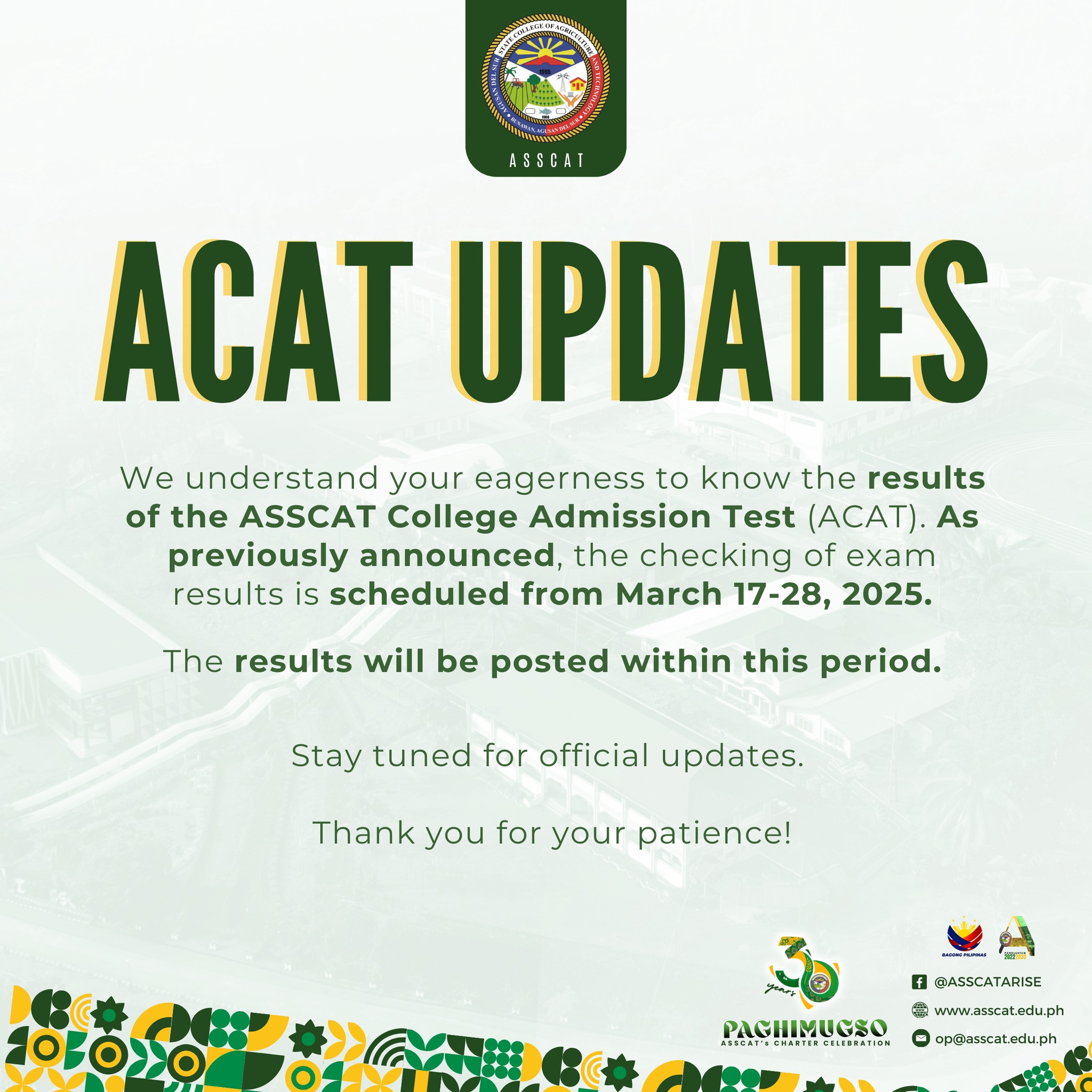 We understand your eagerness to know the results of the ASSCAT College Admission Test (ACAT). As previously announced, the checking of exam results is scheduled from March 17-28, 2025.  The results will be posted within this period. For student-related concerns, you can …