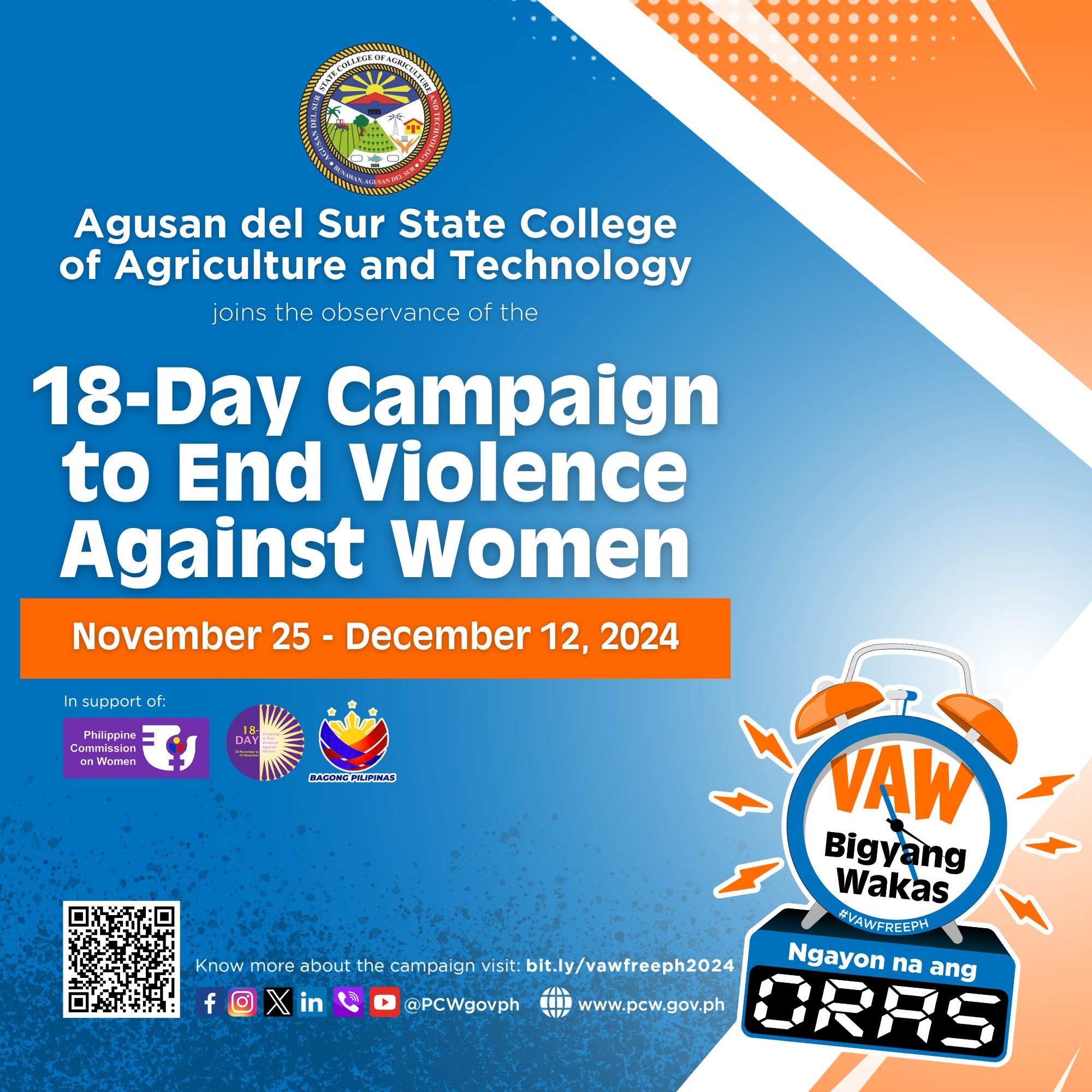 The Agusan del Sur State College of Agriculture and Technology (ASSCAT) proudly joins the nation in the ๐ญ๐ด-๐๐ฎ๐ ๐๐ฎ๐บ๐ฝ๐ฎ๐ถ๐ด๐ป ๐๐ผ ๐๐ป๐ฑ ๐ฉ๐ถ๐ผ๐น๐ฒ๐ป๐ฐ๐ฒ ๐๐ด๐ฎ๐ถ๐ป๐๐ ๐ช๐ผ๐บ๐ฒ๐ป (๐ฉ๐๐ช) ๐ณ๐ฟ๐ผ๐บ ๐ก๐ผ๐๐ฒ๐บ๐ฏ๐ฒ๐ฟ ๐ฎ๐ฑ ๐๐ผ ๐๐ฒ๐ฐ๐ฒ๐บ๐ฏ๐ฒ๐ฟ ๐ญ๐ฎ! This year, with the sub-theme โVAW Bigyang Wakas, Ngayon …