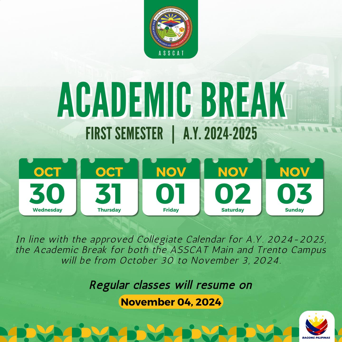 In line with the approved Collegiate Calendar for A.Y. 2024-2025, the Academic Break for both the ASSCAT Main and Trento Campus will be from October 30 to November 3, 2024.ย During this period, ๐๐ก๐ก ๐๐๐๐ช๐ก๐ฉ๐ฎ ๐ข๐๐ข๐๐๐ง๐จ ๐๐ง๐ ๐ง๐๐ข๐๐ฃ๐๐๐ ๐ฉ๐ค ๐ฅ๐๐ช๐จ๐ ๐๐ก๐ก …