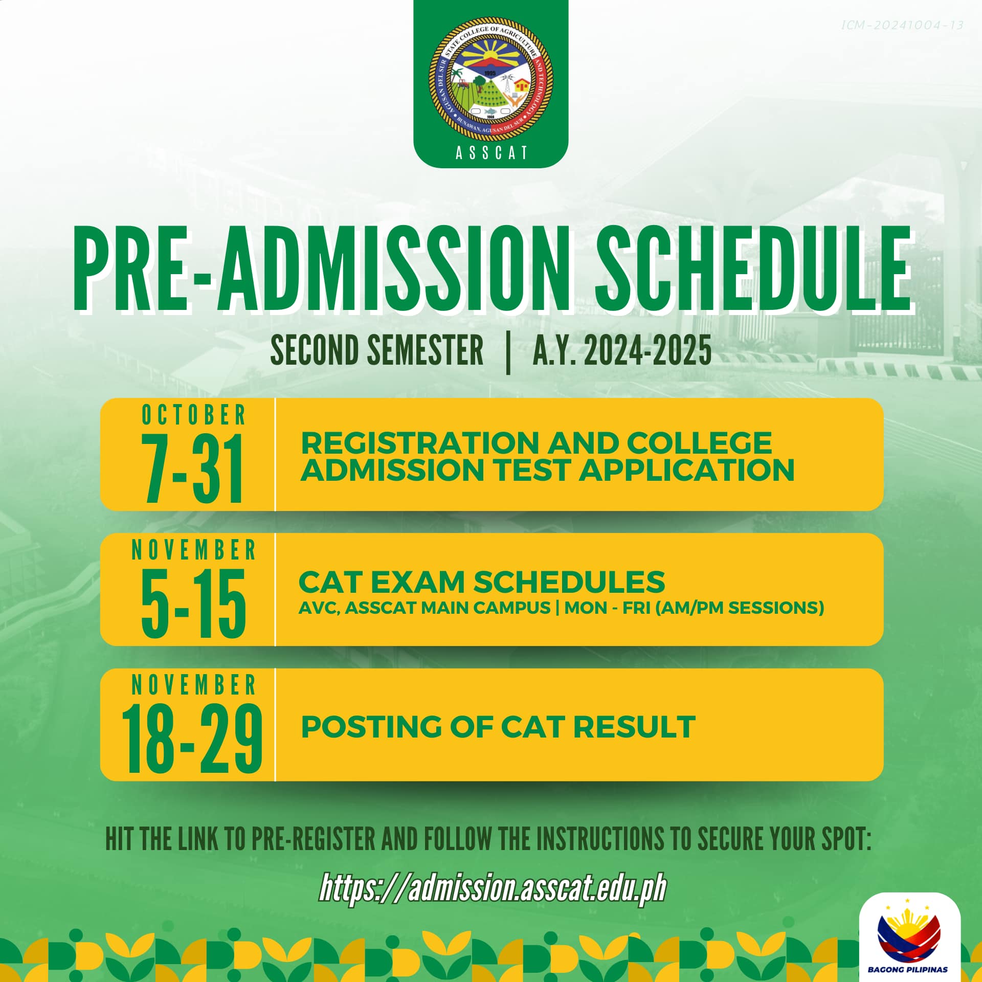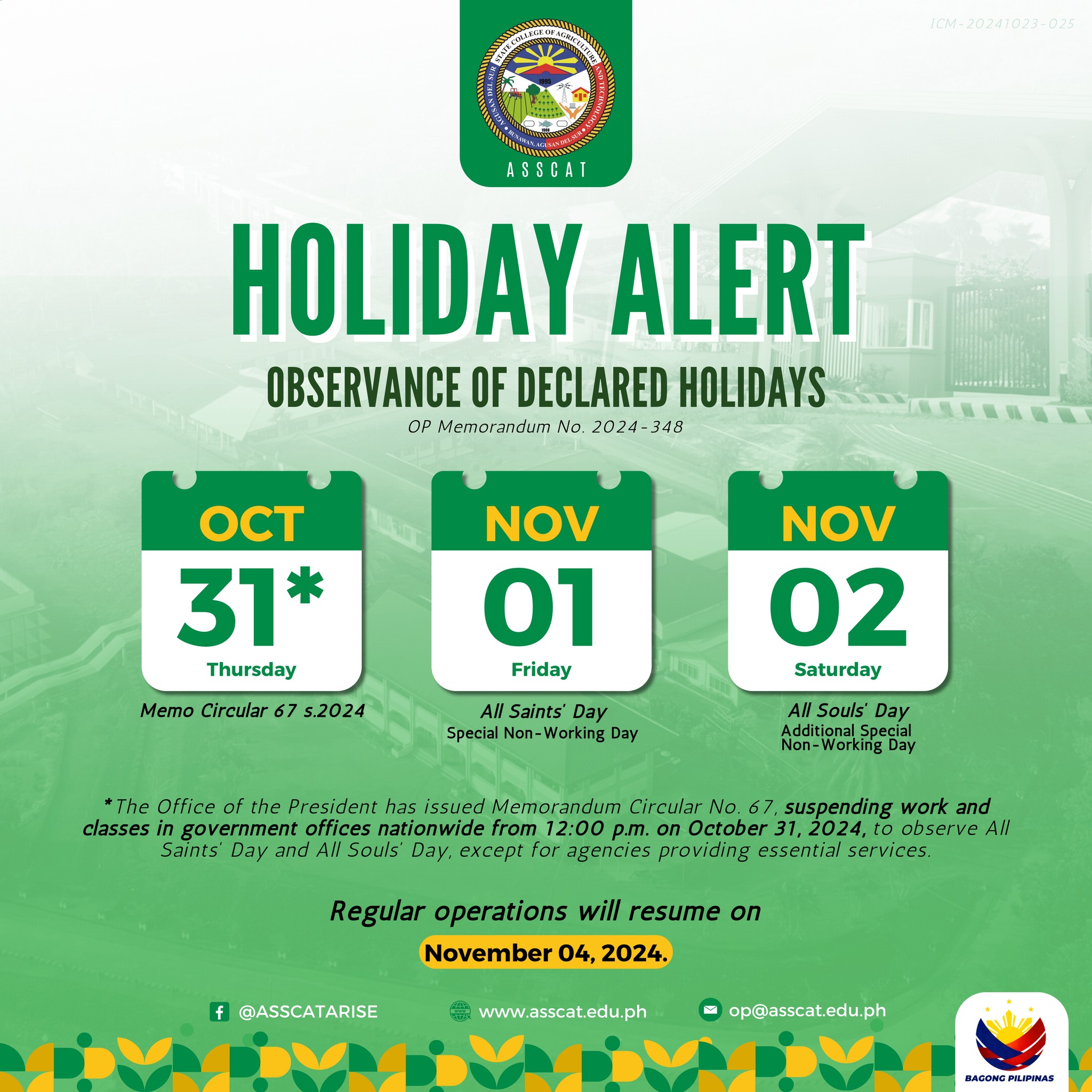 In line with OP Memorandum No. 2024-348 and Memo Circular 67 s.2024, ASSCAT will suspend work and classes starting at 12:00 PM on October 31 to observe All Saints’ Day and All Souls’ Day. ๐ข๐ฐ๐๐ผ๐ฏ๐ฒ๐ฟ ๐ฏ๐ญ โ Half-Day Suspension (๐ณ๐ฟ๐ผ๐บ …