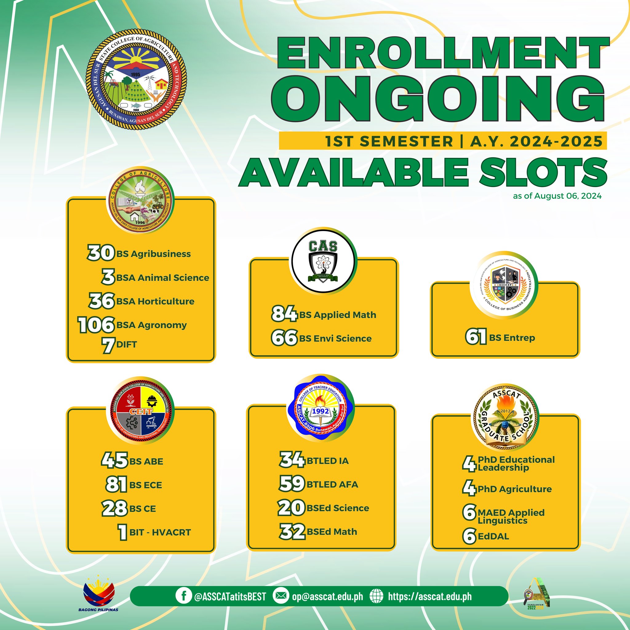 Don’t miss your chance to join us for the 1st Semester of A.Y. 2024-2025! We have available slots in various programs across our colleges. Secure your spot today and be part of our vibrant academic community! ๐๐น๐ฎ๐๐๐ฒ๐ ๐ฆ๐๐ฎ๐ฟ๐: ๐๐๐ด๐๐๐ ๐ญ๐ฎ, …
