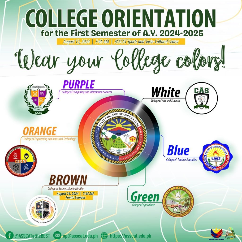 ๐–๐ž๐š๐ซ ๐˜๐จ๐ฎ๐ซ ๐‚๐จ๐ฅ๐ฅ๐ž๐ ๐ž ๐‚๐จ๐ฅ๐จ๐ซ๐ฌ! Show your school spirit by wearing your designated college colors. Be punctual and bring your school ID.