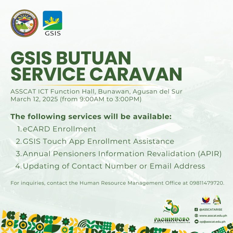 Take advatage of the GSIS Service Caravan this March 12, 2025 (Wednesday), from 9:00 AM to 3:00 PM at the ICT Function Hall, ASSCAT Main Campus, Bunawan, Agusan del Sur.
