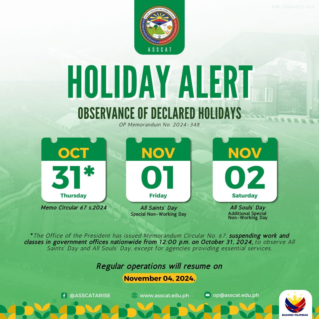 In line with OP Memorandum No. 2024-348 and Memo Circular 67 s.2024, ASSCAT will suspend work and classes starting at 12:00 PM on October 31 to observe All Saints’ Day and All Souls’ Day.
