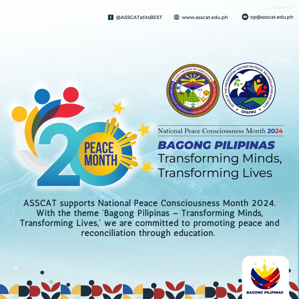 Agusan del Sur State College of Agriculture and Technology (ASSCAT) supports National Peace Consciousness Month 2024. With the theme “Bagong Pilipinas – Transforming Minds, Transforming Lives,” we stand with the nation in promoting peace and unity.