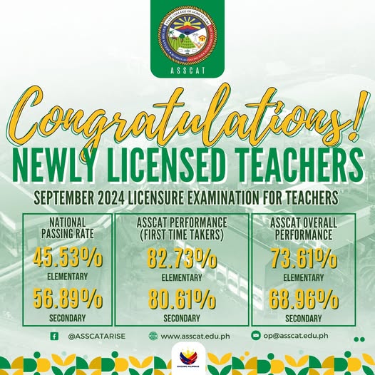 Agusan del Sur State College of Agriculture and Technology (ASSCAT) congratulates the passers of the 𝐒𝐞𝐩𝐭𝐞𝐦𝐛𝐞𝐫 𝟐𝟎𝟐𝟒 𝐋𝐢𝐜𝐞𝐧𝐬𝐮𝐫𝐞 𝐄𝐱𝐚𝐦 𝐟𝐨𝐫 𝐓𝐞𝐚𝐜𝐡𝐞𝐫𝐬 (𝐋𝐄𝐓)!