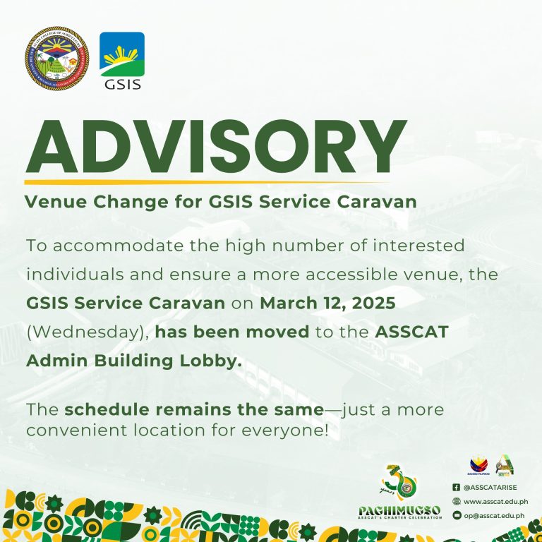 To accommodate the high number of interested individuals and ensure a more accessible venue, the GSIS Service Caravan on March 12, 2025 (Wednesday), from 9:00 AM to 3:00 PM has been moved to the ASSCAT Admin Building Lobby.